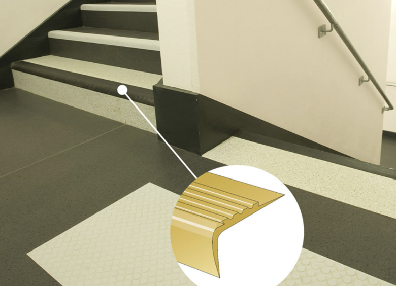 La première et la dernière marche de chaque volée d’escalier doivent être contrastées. Les paliers doivent être caractérisés par un changement de ton contrasté. Le dessus des nez doit être bien visible par un contraste de couleurs et/ou de textures.