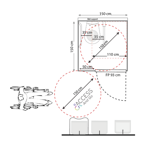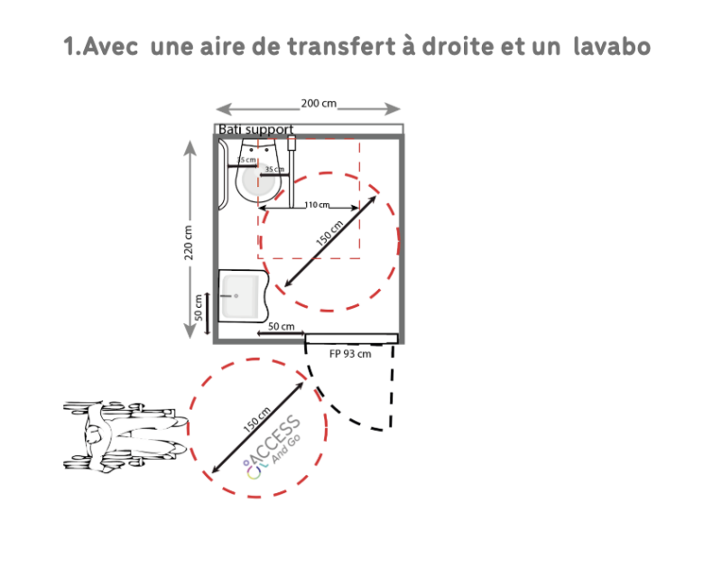 Seul un lave-main est toléré. - aire de transfert située face à la porte. Elle doit être d’au moins 110 cm. Cette mesure se prend depuis l’axe de la cuvette. Elle a une profondeur de 130 cm. Les aires de transfert et de rotation peuvent se chevaucher.